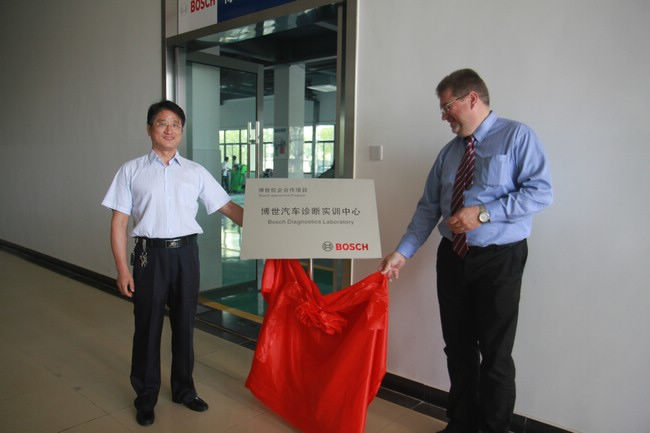 2012年10月8日上午博世集团汽车售后事业部执行副总裁文斯托夫先生,南京博世总经理马克思等一行到访千亿官方网站参观并举行“博世汽车诊断实训中心”揭牌与“博世南京双元制合作班”开班仪式。