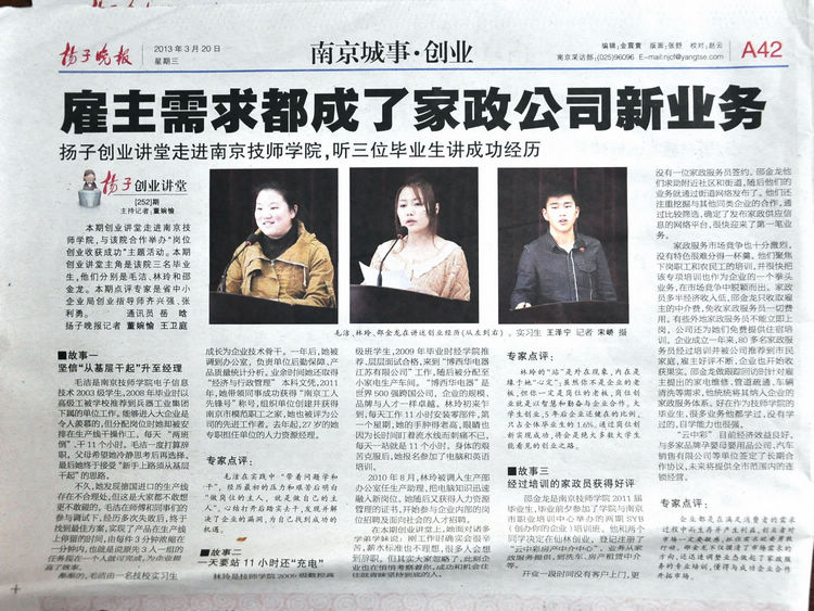 《扬子晚报》A42版—《雇主需求都成了家政公司新业务——扬子创业讲堂走进千亿官方网站,听三位毕业生讲成功经历》