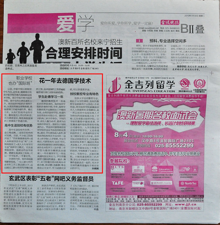 《金陵晚报》B2叠—《职业学校也办“国际班”— 花一年去德国学技术》