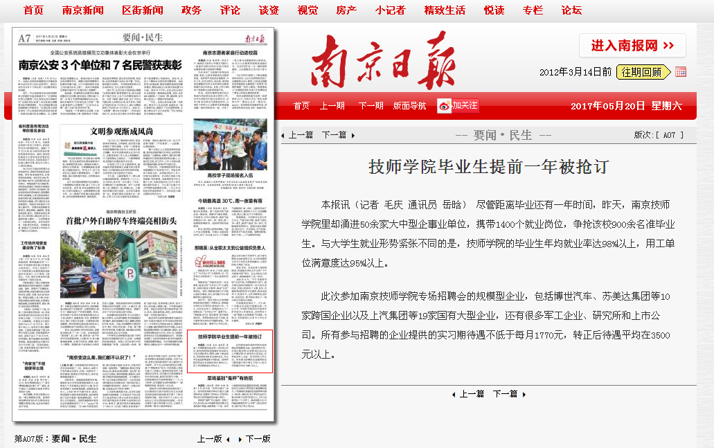 《南京日报》A7—技师学院毕业生提前一年被抢订