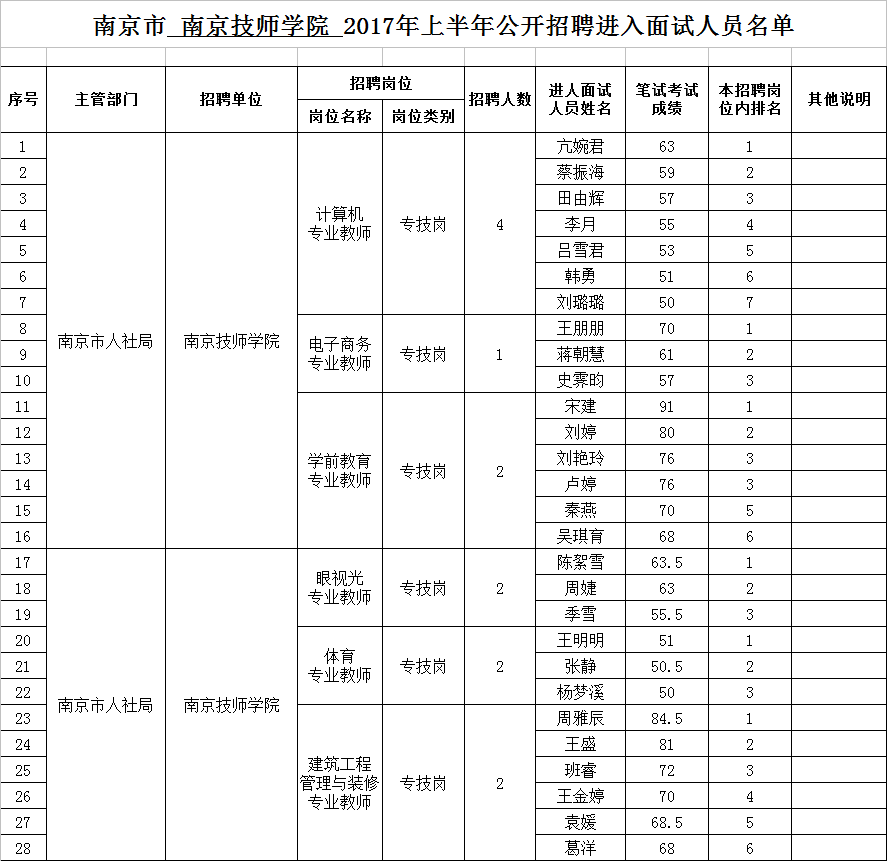 南京市 千亿官方网站 2017年上半年公开招聘进入面试人员名单