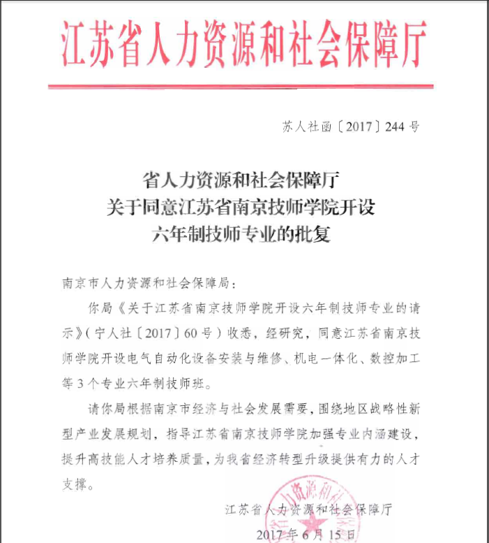 我院接到《省人力资源和社会保障厅关于同意江苏省千亿官方网站开设六年制技师专业的批复》(苏人社函[2017]244号),同意开设电气自动化设备安装与维修、机电一体化、数控加工等3个专业。