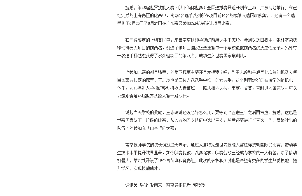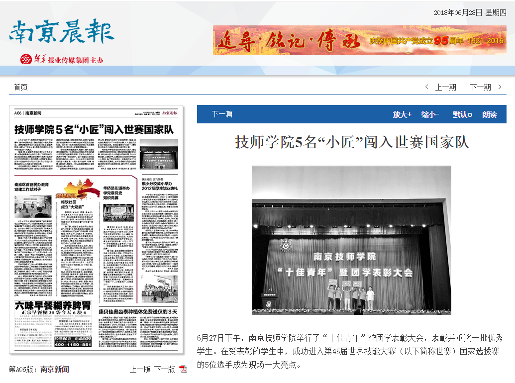 《南京晨报》—A06技师学院5名“小匠”闯入世赛国家队