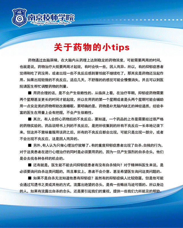 我们通过广场心理咨询活动的方式向学生宣传普及抑郁症的基本知识,告知学生抑郁症的表现,如何治疗抑郁症以及如何正确对待抑郁症患者。同时,我们在活动现场准备了希望气球,请参与活动的同学签名并留下祝福语。活动中,不少同学表示自己曾有过抑郁的感受,此次活动中学到的知识对自己有非常大的帮助!