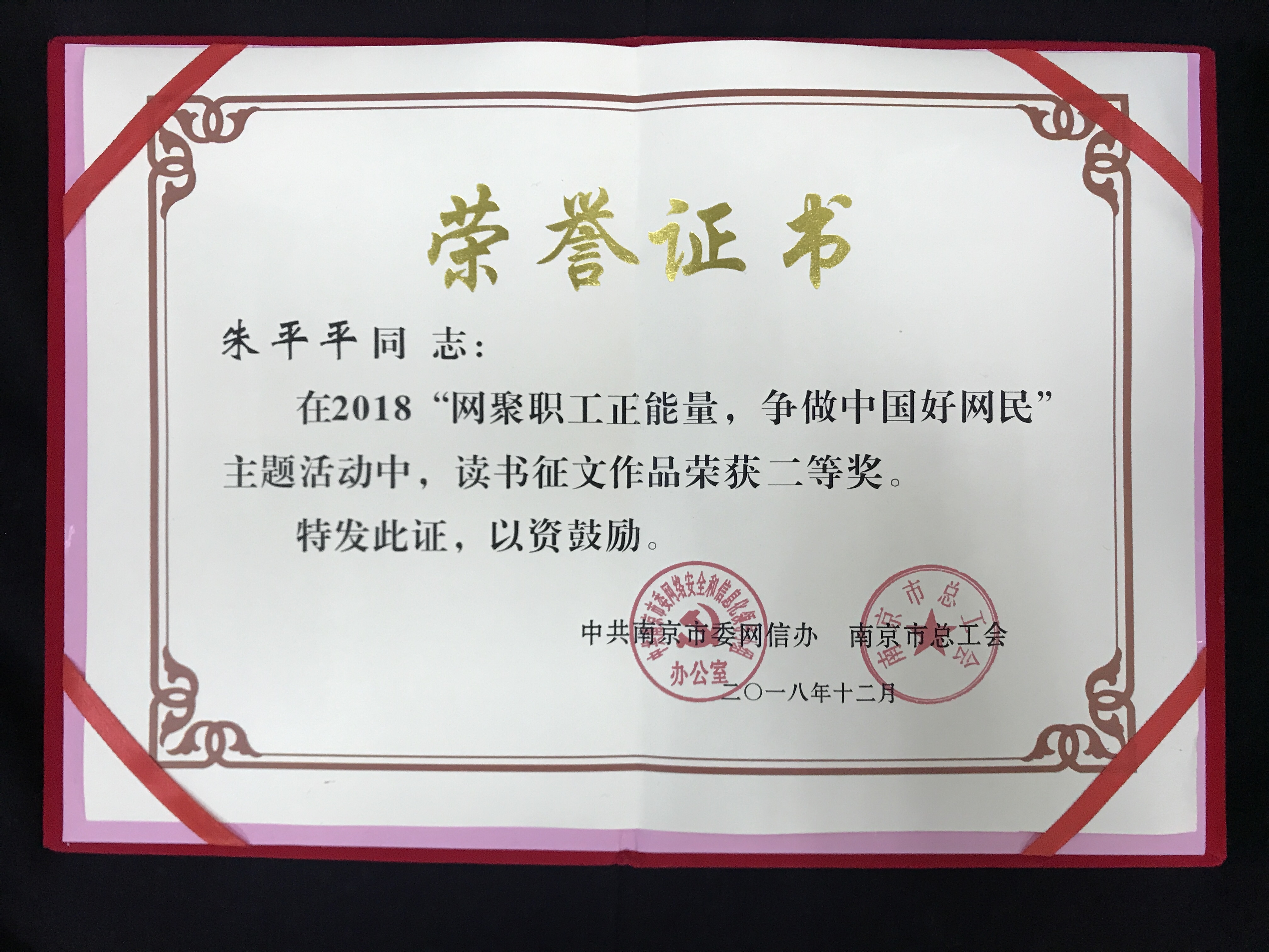 2018年市总工会联合市委网信办首次开展“网聚职工正能量 争做中国好网民”主题活动,主要内容是“五个一”网络作品征集和展示:一部公益广告(视频和海报),一幅“画面故事”,一篇“网络好职工”读书征文,一段“网言网语”,一个“我为南京发展作贡献”金点子。我院机械系教师朱平平的“我遇到你,是最美好的开始--敬一丹《我遇到你》读后感”荣获征文作品二等奖。