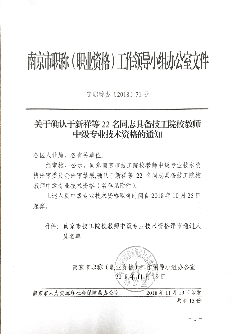 关于确认于新祥等22名同志具备技工院校教师中级专业技术资格的通知