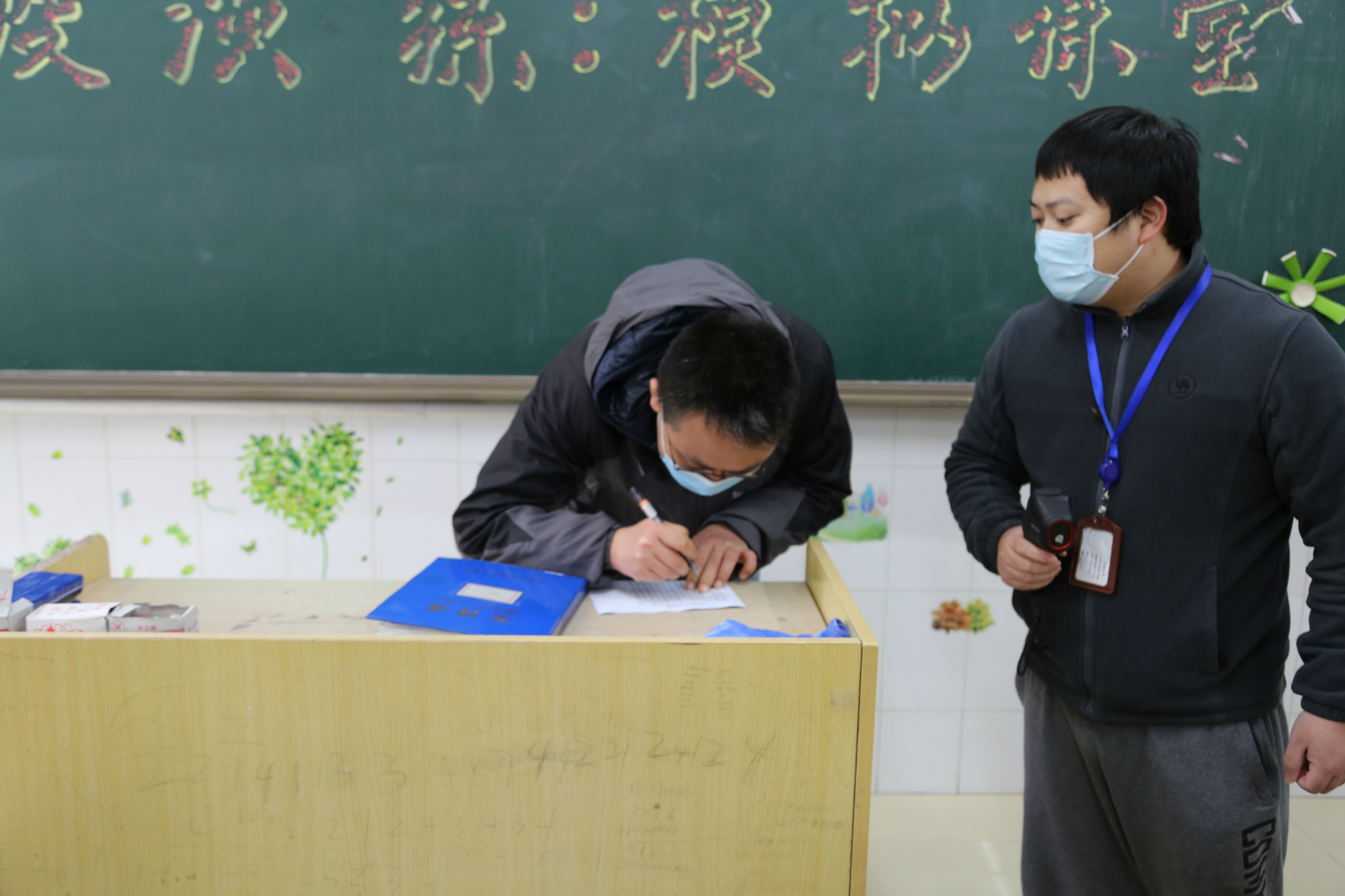 早自习,学生约20人在教室就坐,班主任进行晨检。班主任测量记录学生体温,并询问身体健康状况。