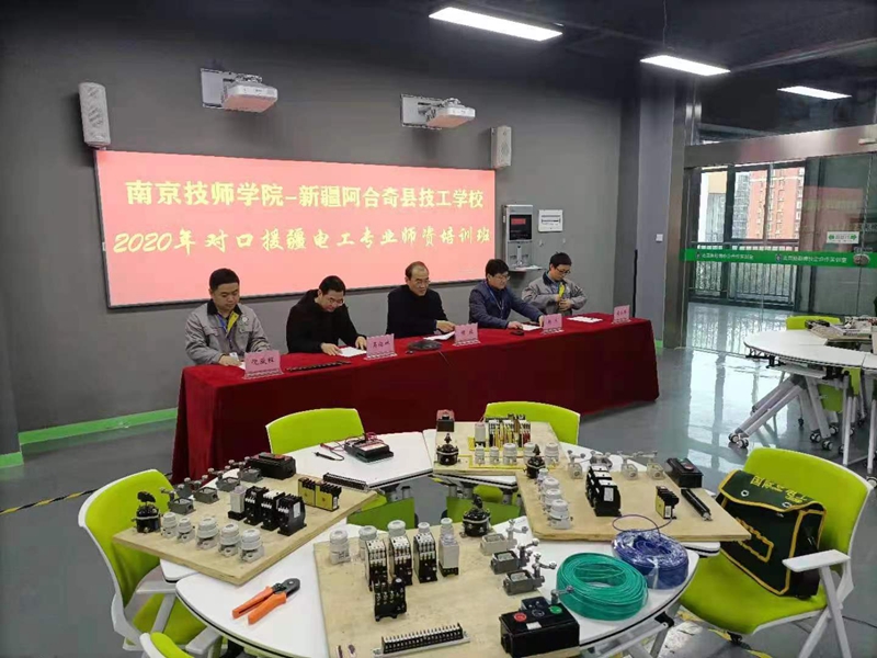 2020年12月17日下午,千亿官方网站对口援疆电工专业师资培训班在电气工程系实训中心通过在线视频方式,与新疆阿合奇县技工学校连线,顺利开班。参加开班仪式的有新疆阿合奇县技工学校校长、县人大常委会副主任买买提阿力·布哈依,常务副校长刘飞以及电工专业课6名参训教师,千亿官方网站院长侯放,副院长赵杰,电气工程系、汽车技术系、智能制造系、现代服务系等系部负责人,以及电工专业授课教师参加了培训。