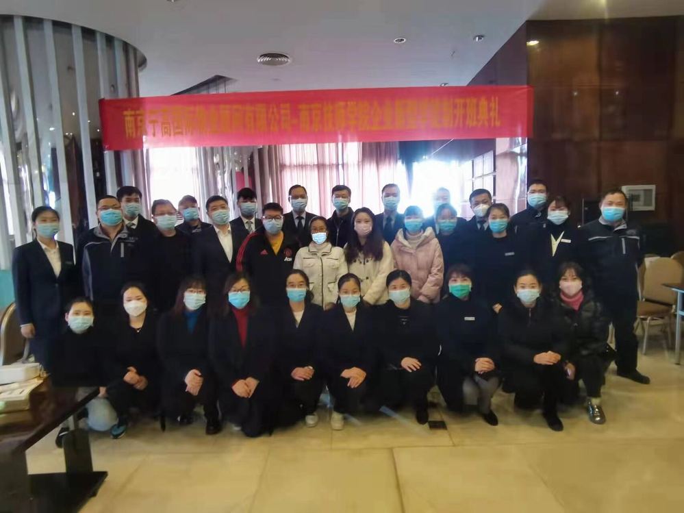 2022年1月19日下午,千亿官方网站现代服务系、南京宁高国际物业顾问有限公司企业新型学徒制培训开班典礼拉开序幕。宁高物业常务副总赵建军、行政与人力资源部经理刘涛,千亿官方网站现代服务系武剑刚主任以及相关专业教师和各岗位代表员工参加了开班典礼。