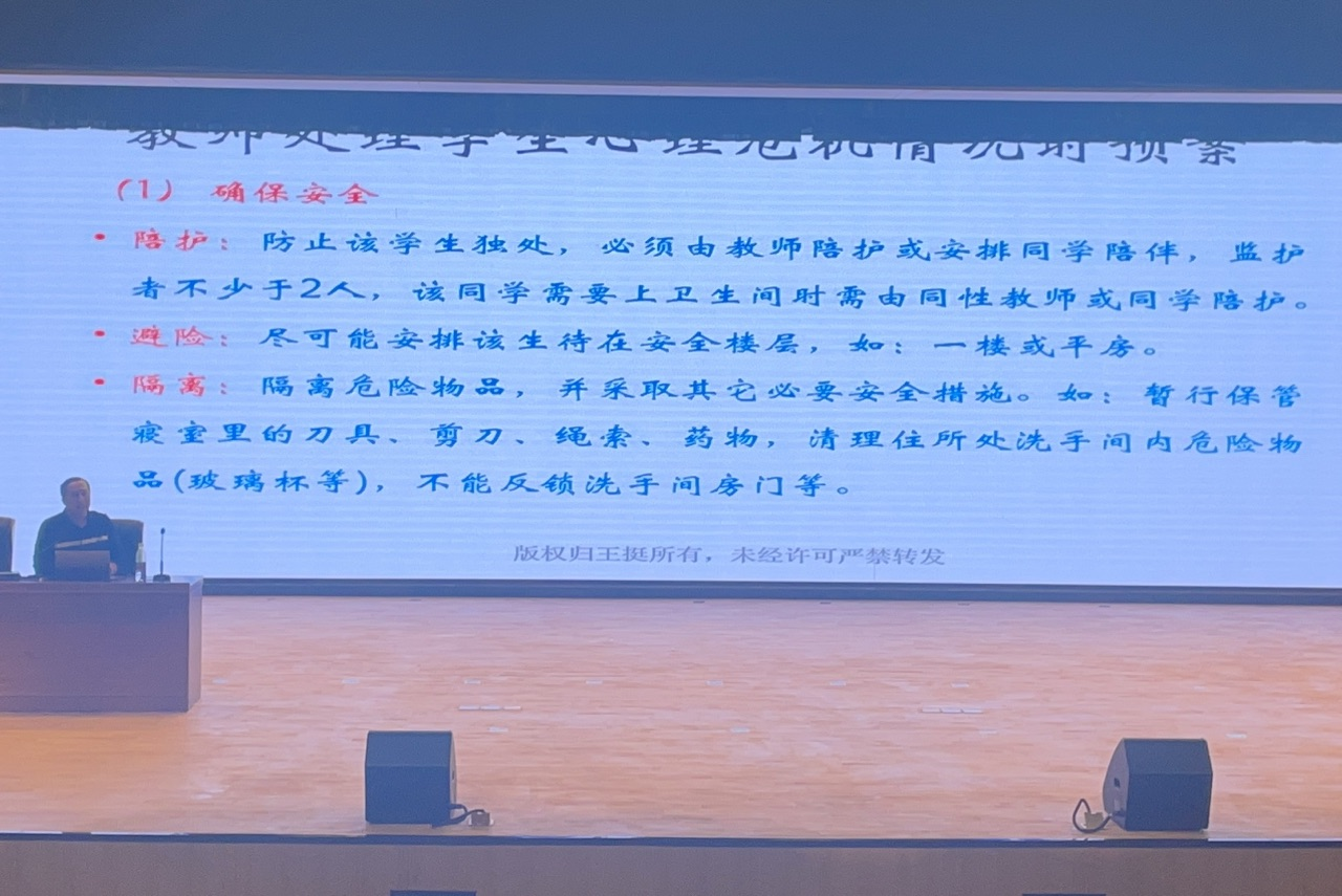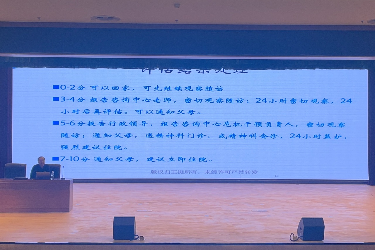 培训分为学生心理危机的甄别、干预与发生危机事件后的应对三部分。首先,王挺教授介绍了如何甄别需重点关注的学生,并对学生状态进行评估;随后介绍了如何对预警学生进行干预与处理并讲解如何建立校园危机干预体系;最后,介绍发生危机事件后的应对措施。