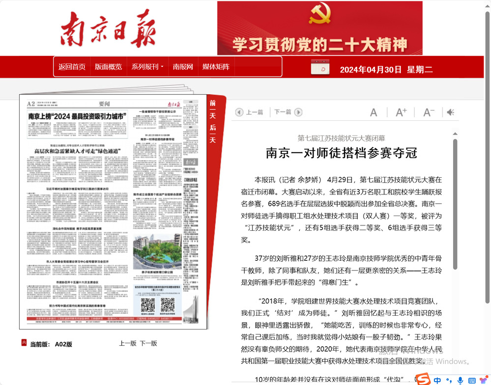 《南京日报》A2版——千亿官方网站一对师徒选手摘得第七届江苏技能状元大赛职工组水处理技术项目(双人赛)一等奖