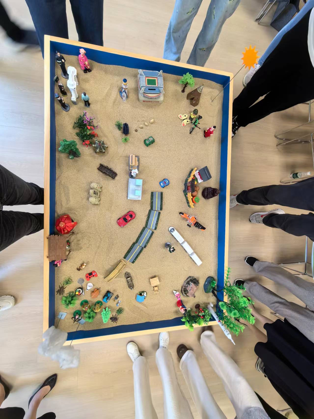 在两天的培训中,两位专家带领教师们了解了该项技术的发展历史,初步掌握其效用原理、作用机制和适用对象个人自由沙盘体验中,教师们仅通过少量沙具的选择和摆放就看见了自己的内心需求和与潜意识进行对话的神奇力量;在团体沙盘全流程模拟中,大家在共同营造一个神奇世界的互动和冲突中,看见彼此对问题理解角度的不同,更看见彼此在团队合作中的理解包容和默默支持。通过多次实操演练参训教师们对沙盘游戏疗法的功效有了深刻体验,有效促进了心理工作团队成员间的理解和信任。