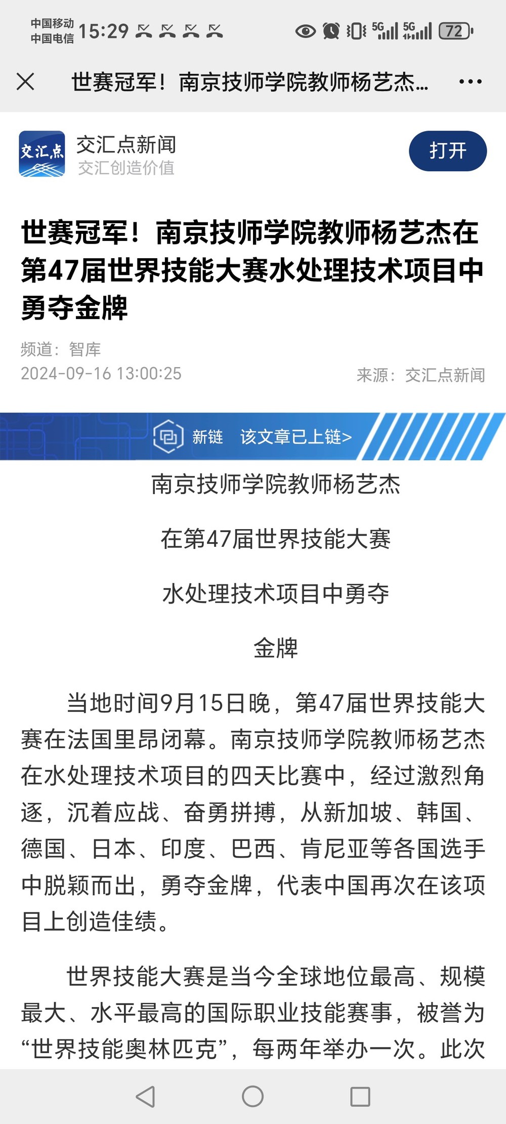 《交汇点新闻》—世赛冠军!千亿官方网站教师杨艺杰在第47届世界技能大赛水处理技术项目中勇夺金牌