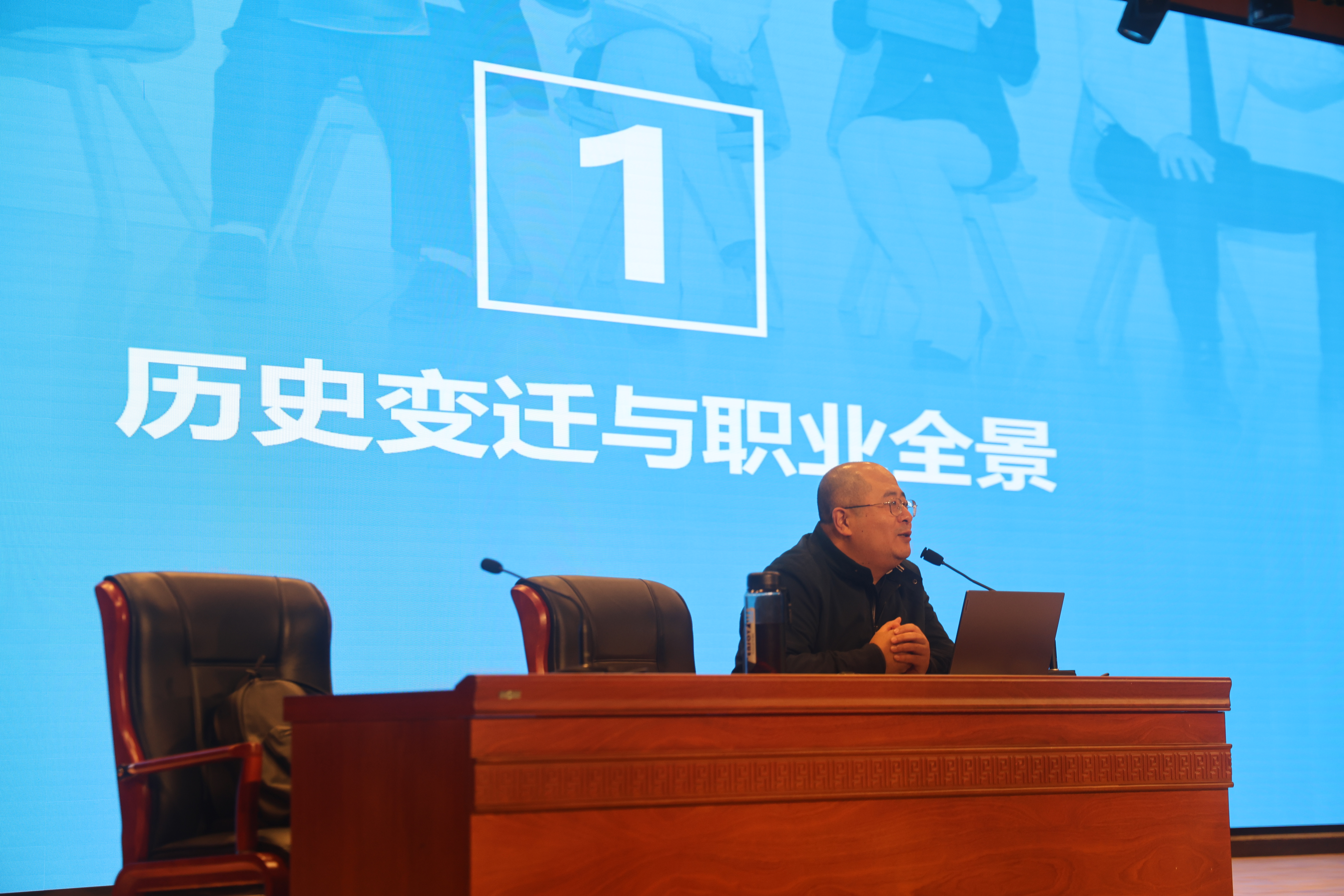 讲座中,周建政老师以《打造新型职业竞争力》、《构建个性化的职业发展蓝图》、《新兴服务业的挑战与机遇》三大主题开展深度解读,紧扣传统行业转型需求与新兴领域发展趋势,系统剖析就业市场的多元化特征。针对不同专业学生如何通过提升专业技能与综合素养适应市场变化,他从课程学习、实践积累、职业认证等维度进行了系统化指导,强调“精准匹配岗位需求”的核心思路。