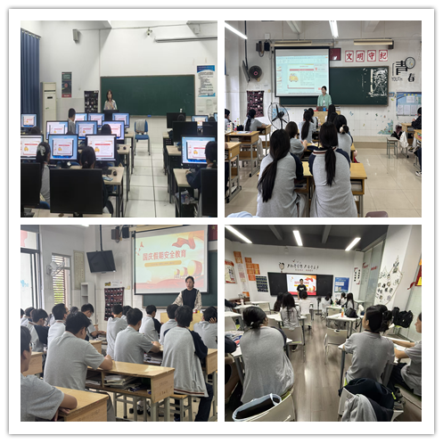班会伊始,各班以喜迎国庆节为主题,通过播放国庆主题纪录片片段、分享祖国发展成就等形式,带领同学们回顾新中国成立以来的辉煌历程,激发大家的爱国情怀与民族自豪感。随后,班会聚焦国庆假期安全须知,重点围绕大安全领域展开:一是出行安全,提醒学生遵守交通规则,避免前往人员密集的高危场所,乘坐正规交通工具;二是居家安全,强调用电、用火、用气安全,警惕电信网络诈骗,不泄露个人信息;三是防疫安全,要求学生做好个人健康监测,出现不适及时就医,不前往疫情重点地区四是严防溺水,提醒学生做到防溺水“六不”。
